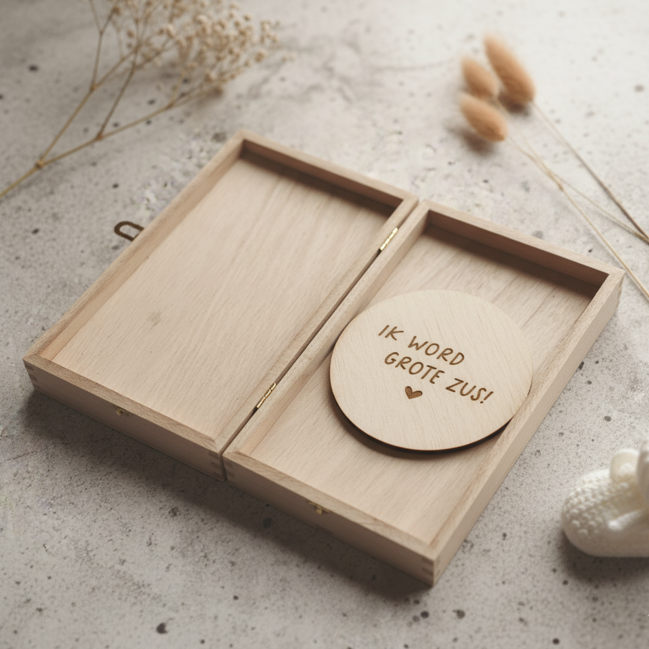 Leuke manier om jullie zwangerschap aan te kondigen! Houten kistje met daarin een houten cirkel "ik word grote zus".